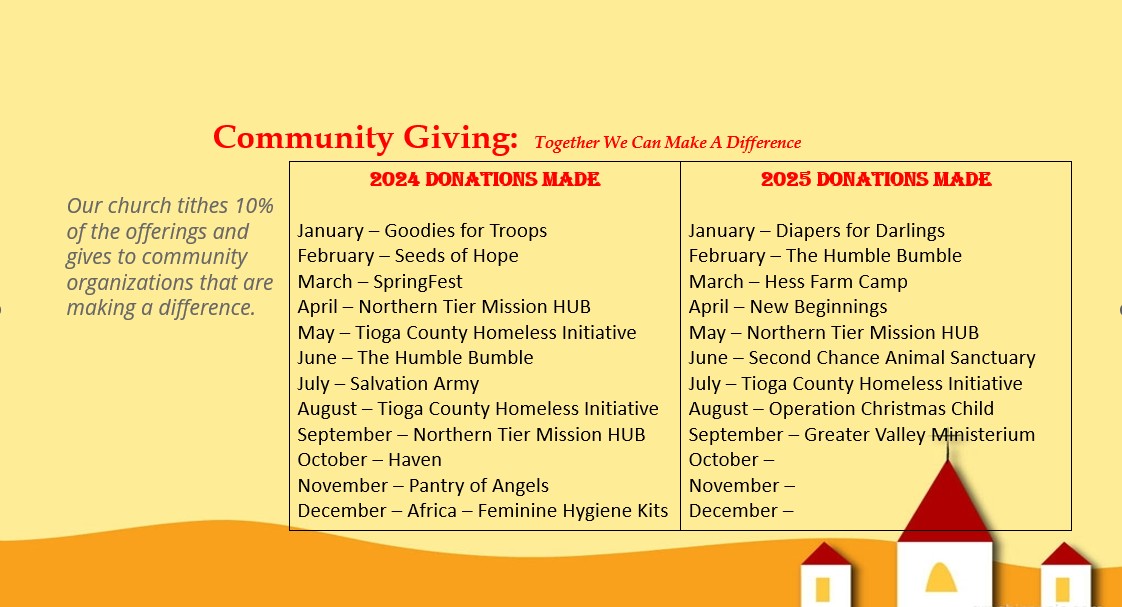 Our church tithes 10% of our weekly offerings to organizations in our community who are making a difference. All that we have, or hope to have, comes from him. The Bible says that tithing is a reminder that God is the supplier of everything. It teaches us to always put God first in our lives.